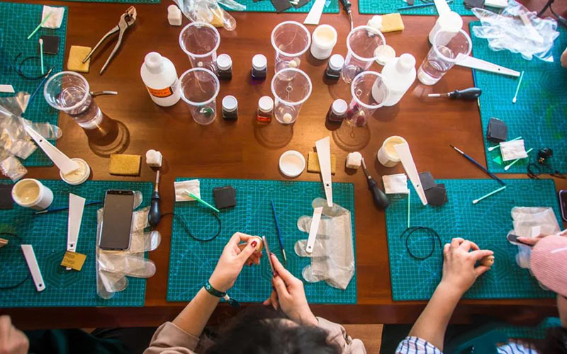 皮艺--皮革小铃铛。这课程是制作和印染皮革铃铛。小小的铃铛,看似个头小、很简单,事实上,裁剪、粘合、打磨、压刻、涂层等十多道工序,尤为考验手工的耐心。通常你制作完,手都在不知不觉的小颤抖。在小姐姐H.O的指导下,完成一个铃铛,需要1个半小时。齐全的工具设备、欢笑的课堂交流,让人沉浸在手工制作的欢乐中。